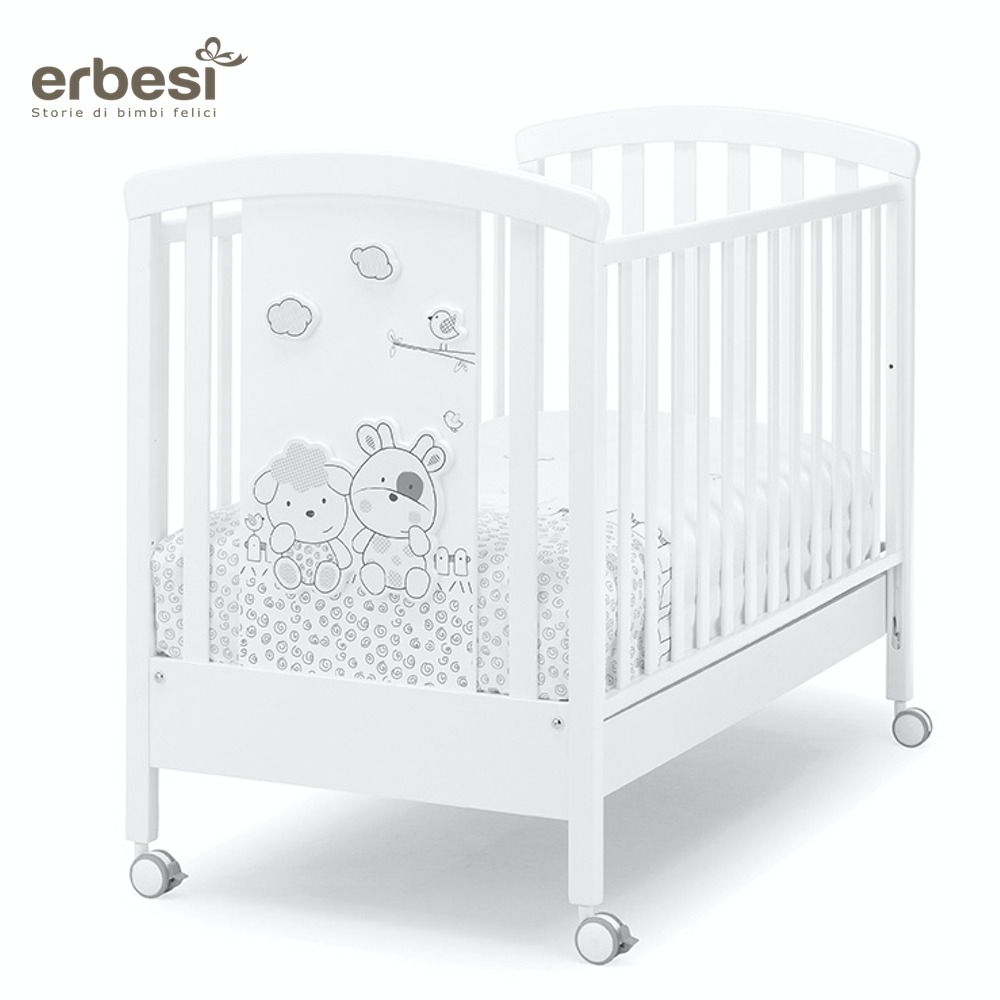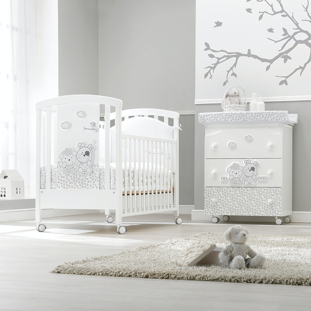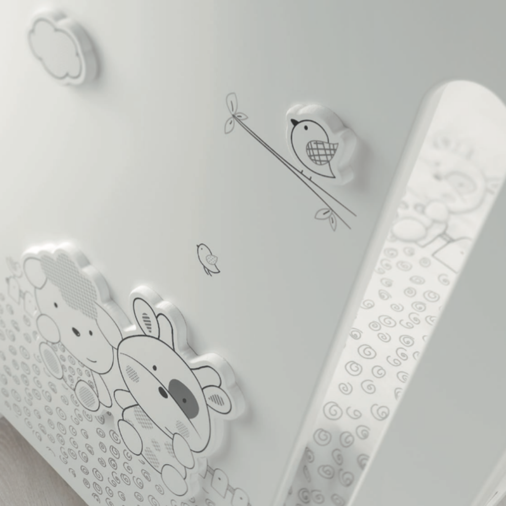 La collezzione si contraddistingue per il tenero orsetto con palloncini ricamato sui tessili e inserito sulla pediera in plaxiglass del lettino ma anche sul bagnetto coordinato.