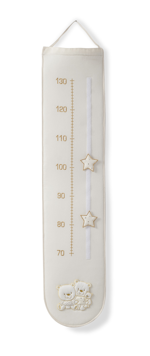 Questo elegante metro tessile è utilizzato per misurare l' altezza dei bimbi, realizzato in tessuto con dolci decorazioni in rilievo.