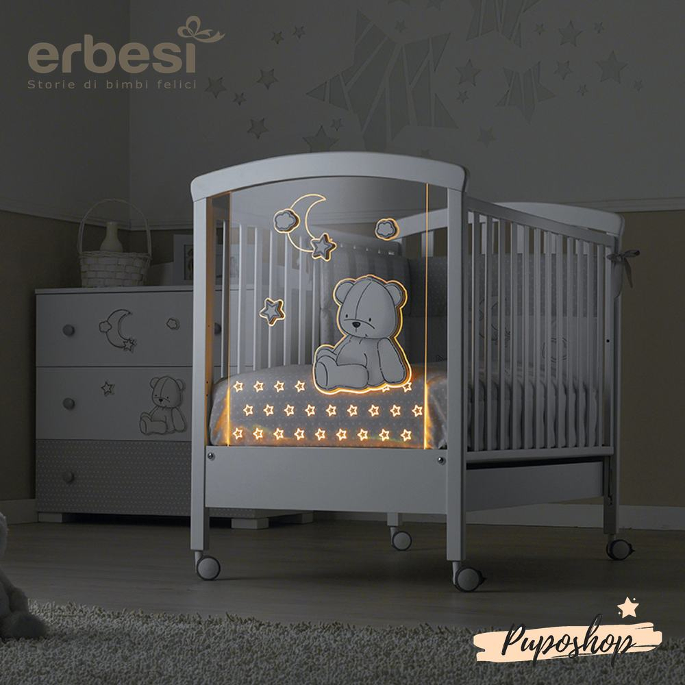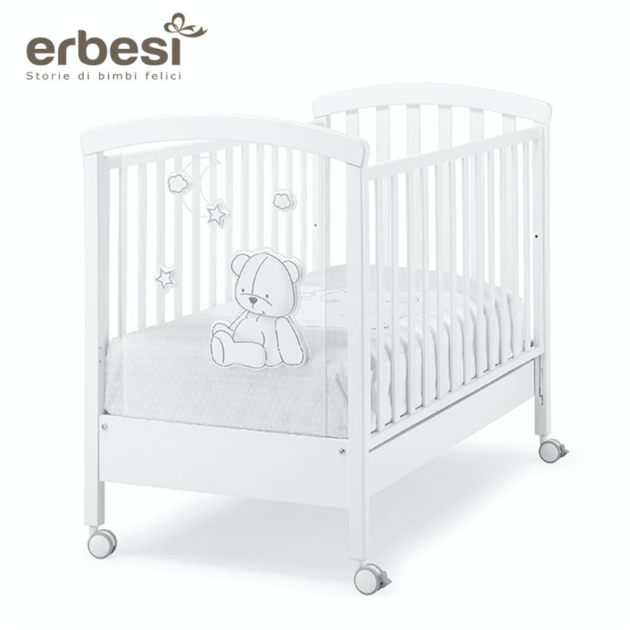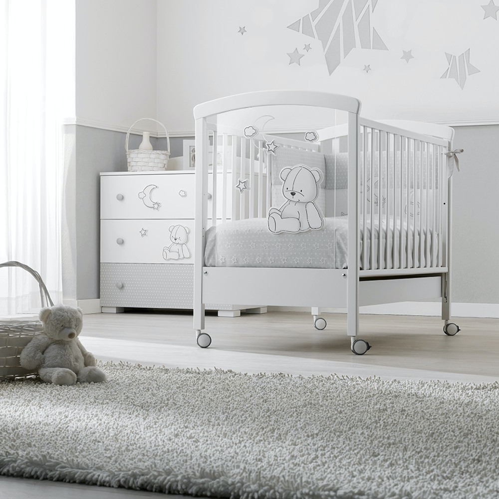 La collezzione si contraddistingue per il tenero orsetto con palloncini ricamato sui tessili e inserito sulla pediera in plaxiglass del lettino ma anche sul bagnetto coordinato.
