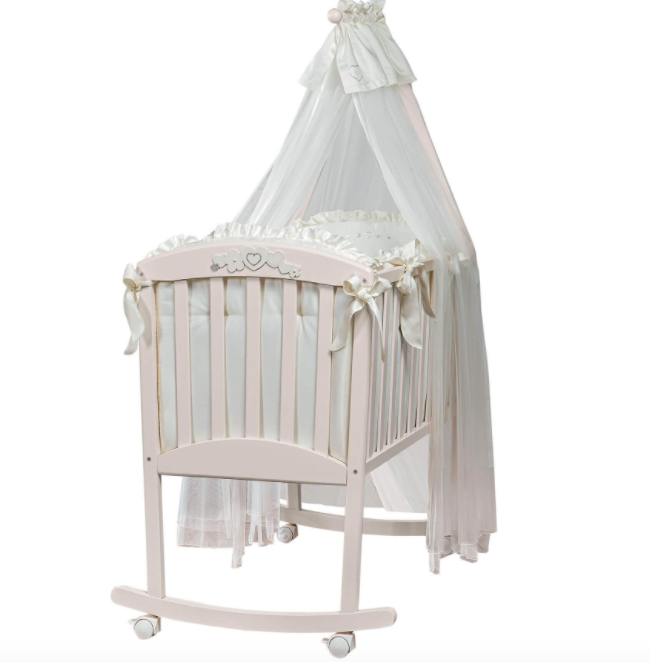 La Struttura in legno di Faggio con funzione dondolo, è arricchita da Swarovski sulla pediera, mentre i tessuti in Organza e Cotone sono delicatamente ricamati a rilievo.