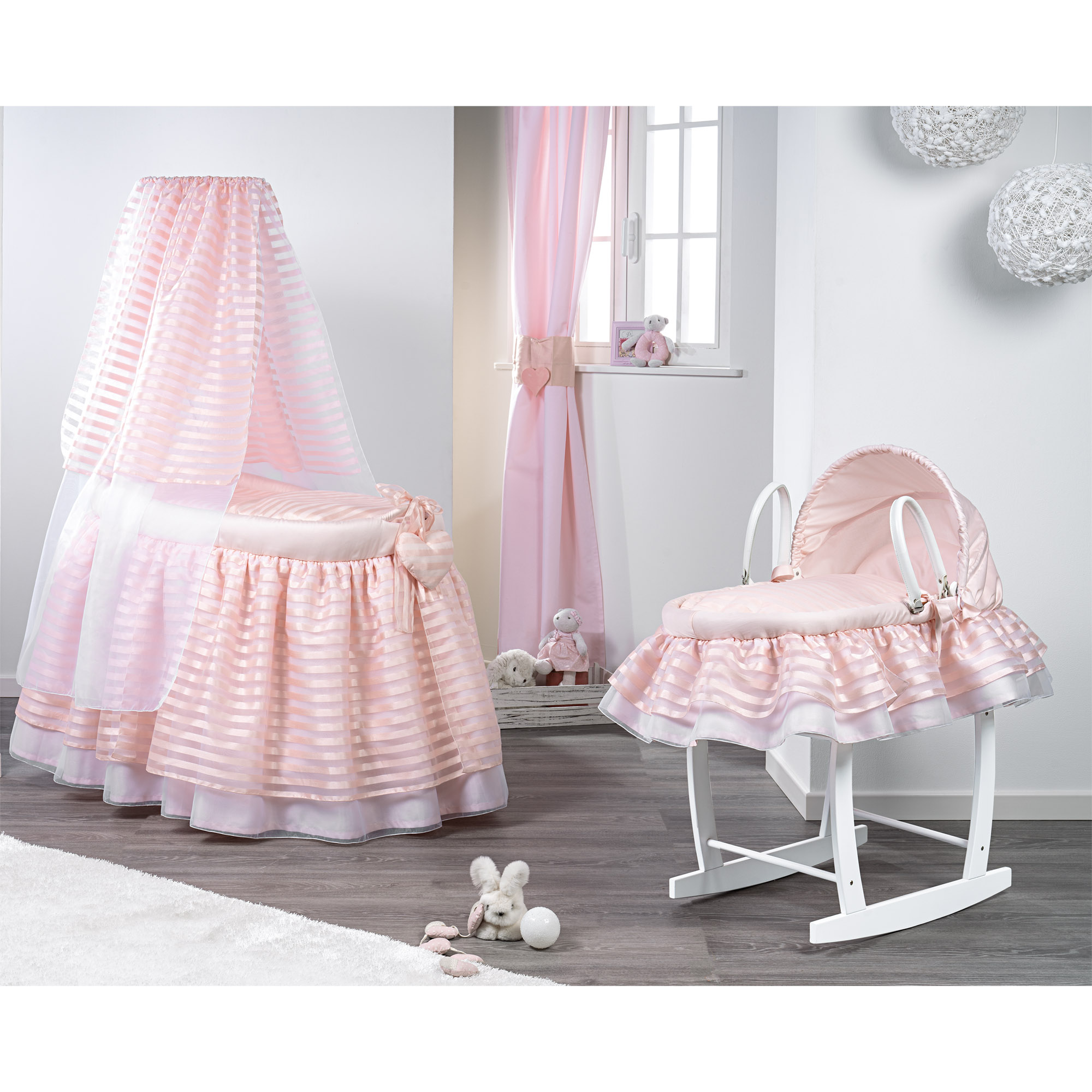 Questa culla molto ricercata ed elegante, arriverà completa di Piumetto con federa e set lenzuola coordinato.