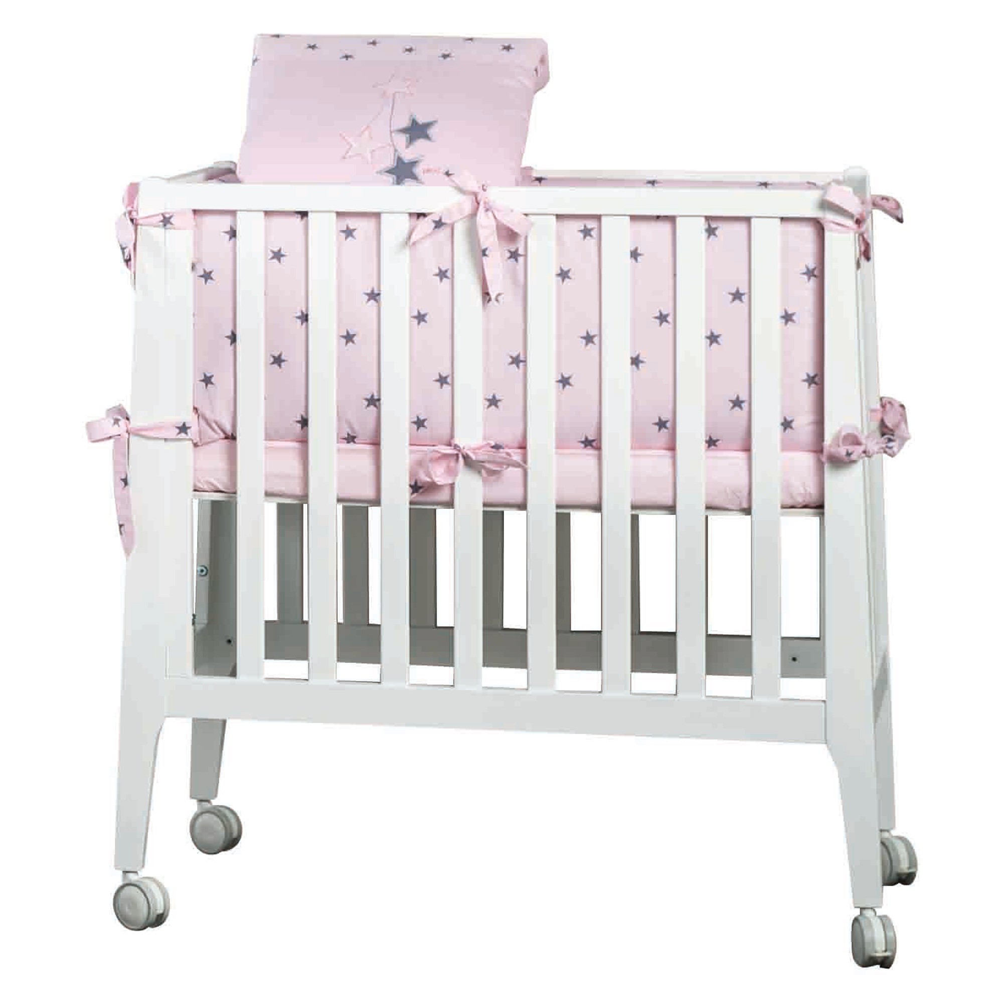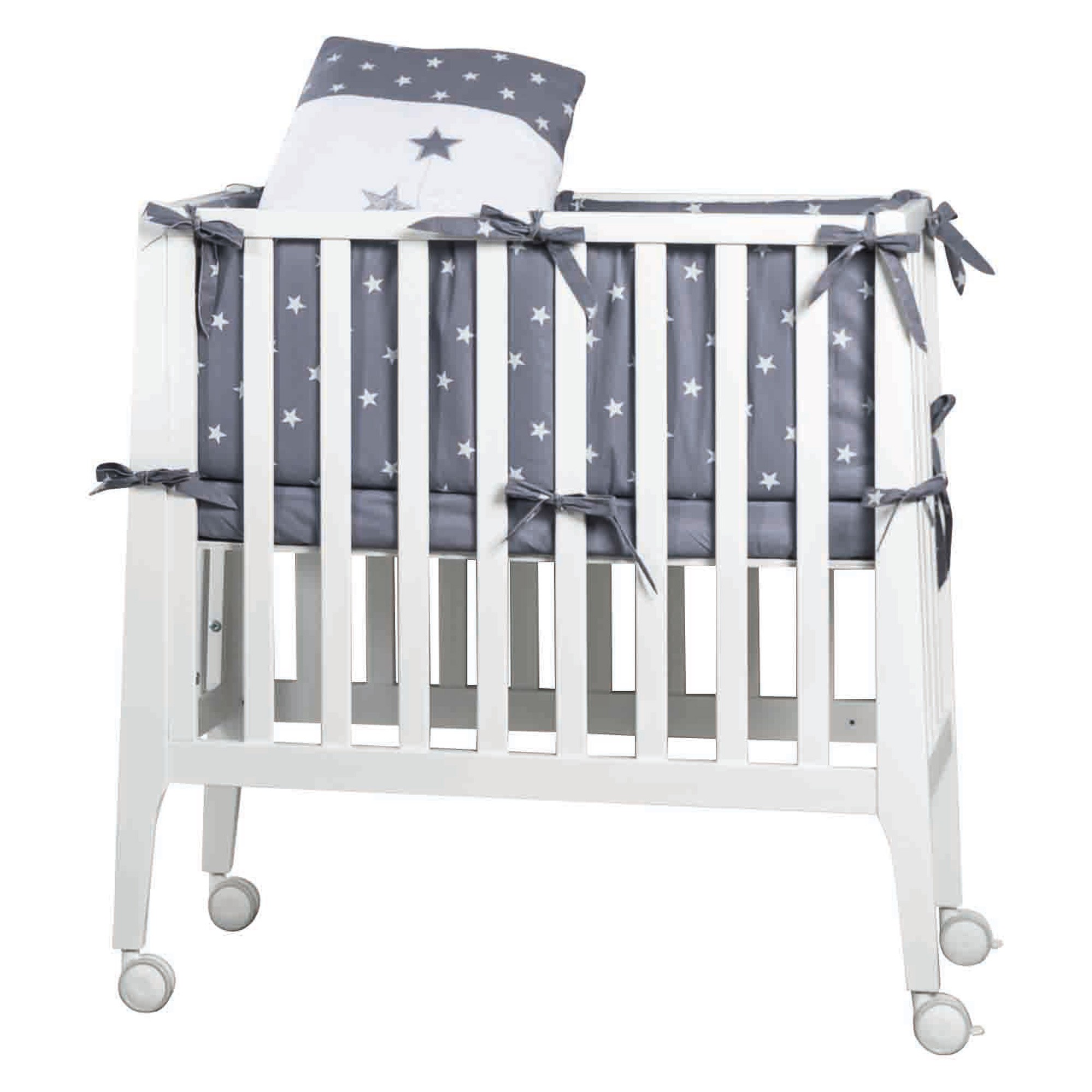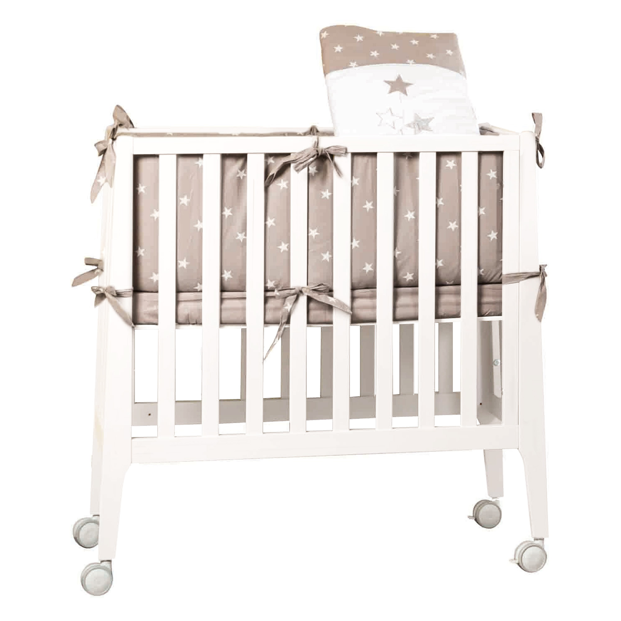 La culla è disponibile nei colori bianco e sabbia mentre, la biancheria coordinata inclusa è disponibile nelle variazioni del grigio, del celeste, del rosa e del beige.
