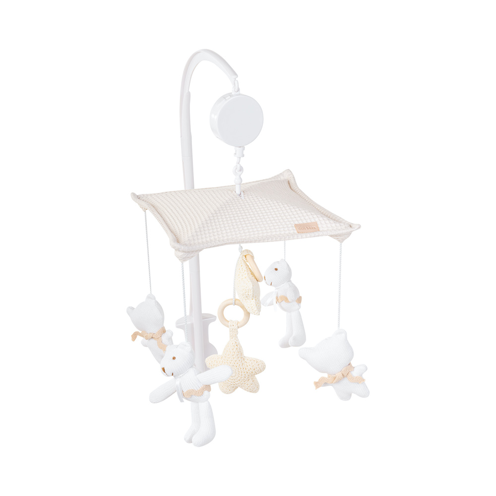 La giostrina con carrillon è arricchita da simpatici soggetti a forma di stelle e orsetti, prodotti in tessuti orgonici.