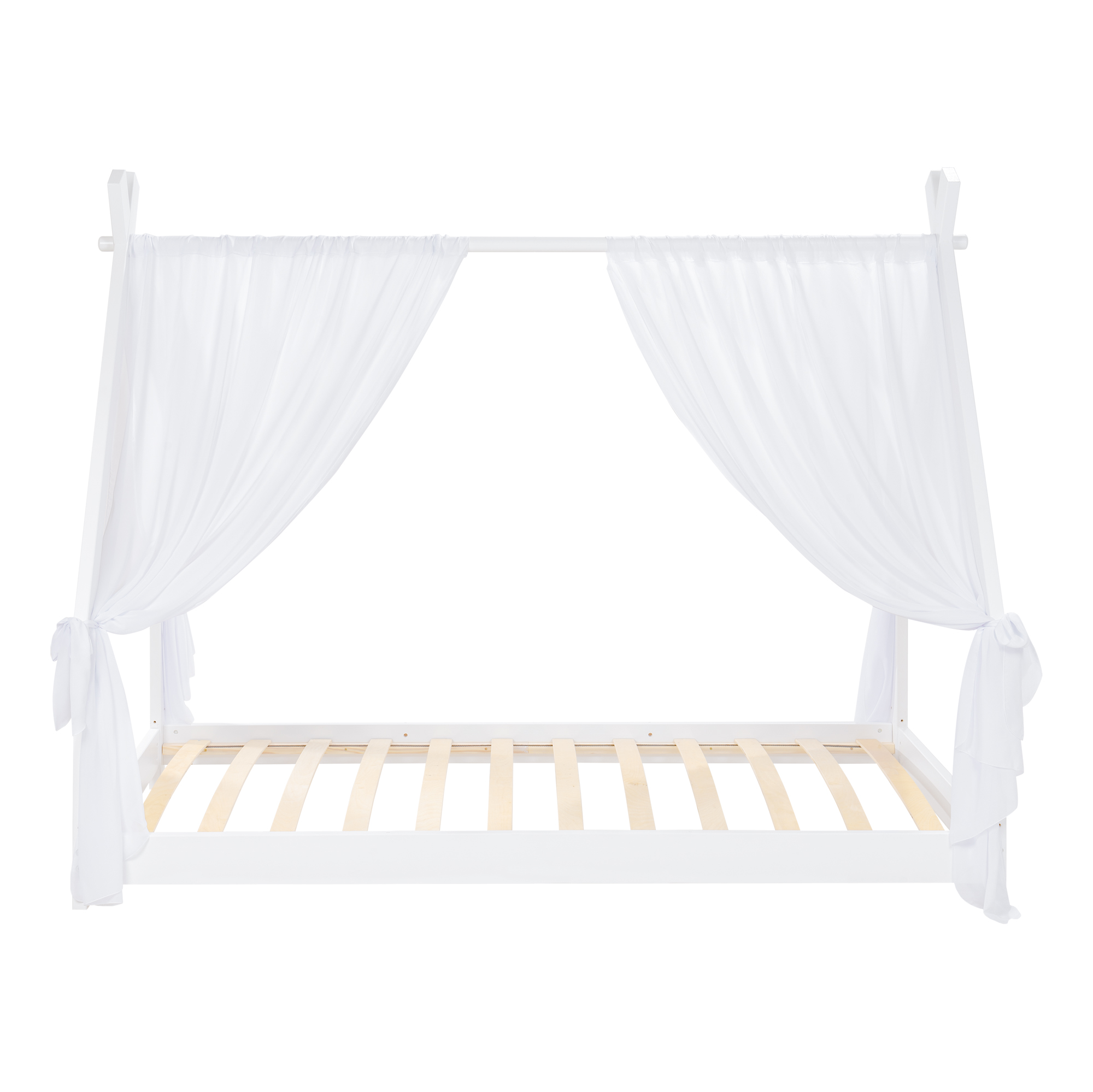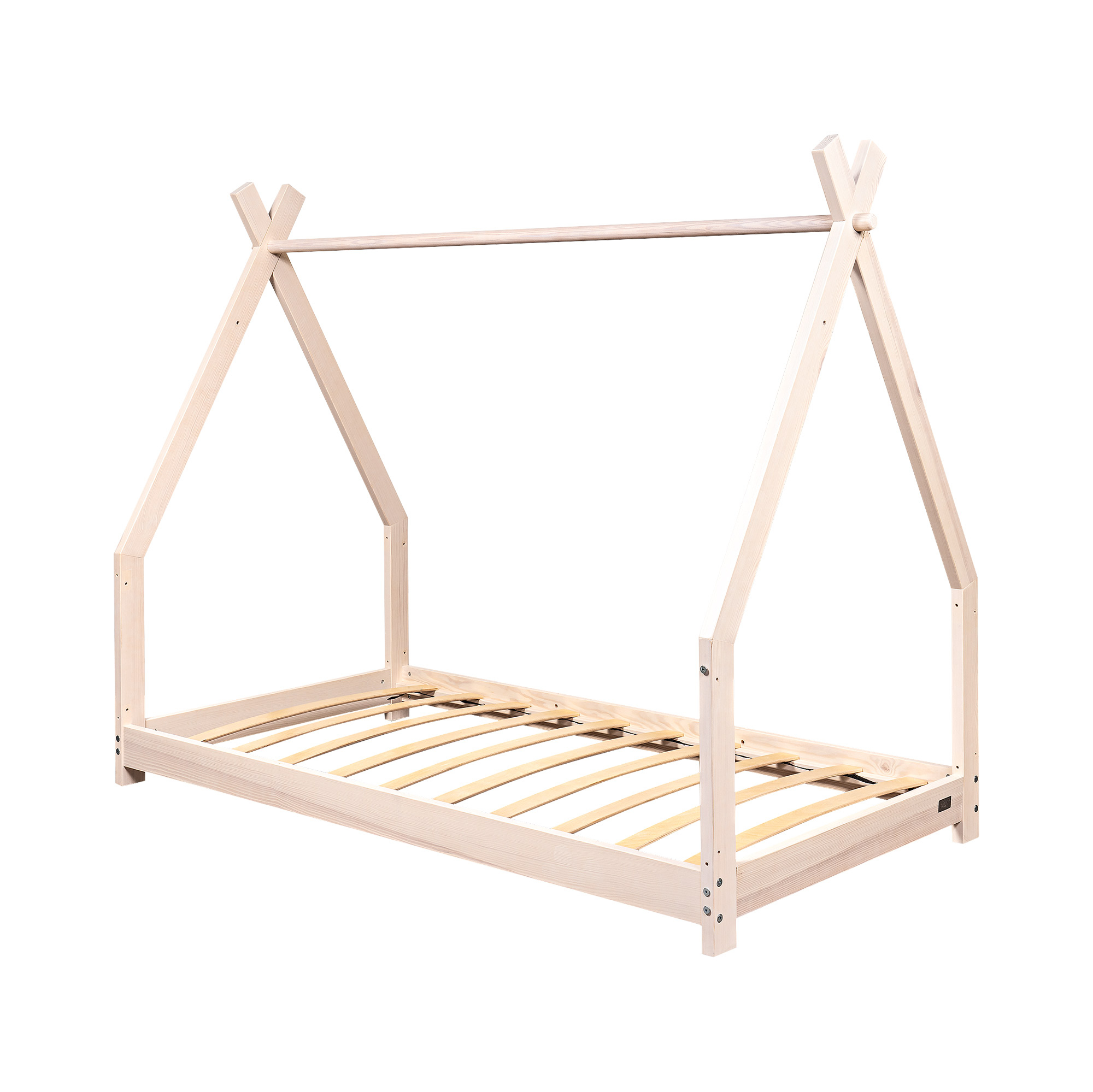 Il Lettino a casetta con doghe ergonomiche, è stato realizzato in legno diPino siberiano, sbiancato con vernici all' acqua.