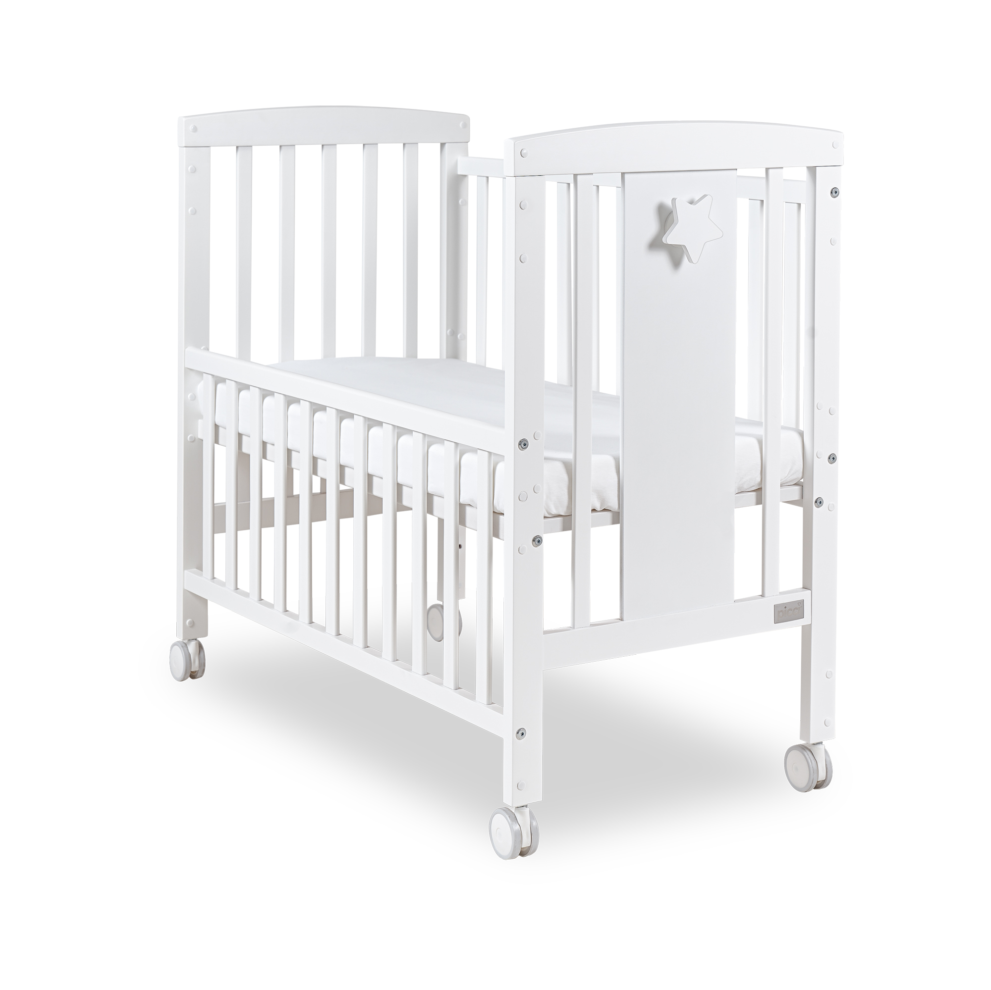 Lella Luce è il nuovo lettino firmato Picci. La struttura è realizzata in legno di fiaggio laccato di colore bianco, arricchita da una stella in rilievo che rende il lettino davvero unico.