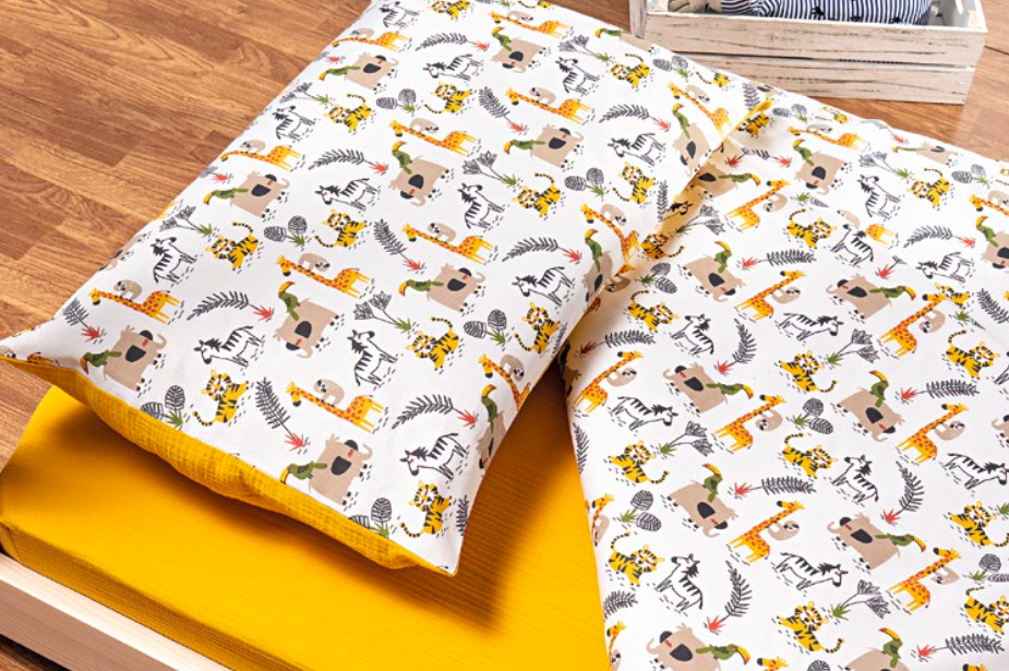 Il SetPiumone per lettino di questa collezione è arricchito da una stampa Natural con richiami agli animali della giungla.