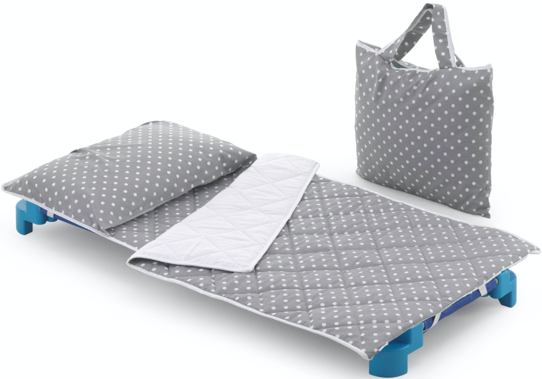 - Materassino realizzato con tessuto ignifugo e con elastici negli angoli per ancorarlo alla brandina (data in dotazione negli asili),