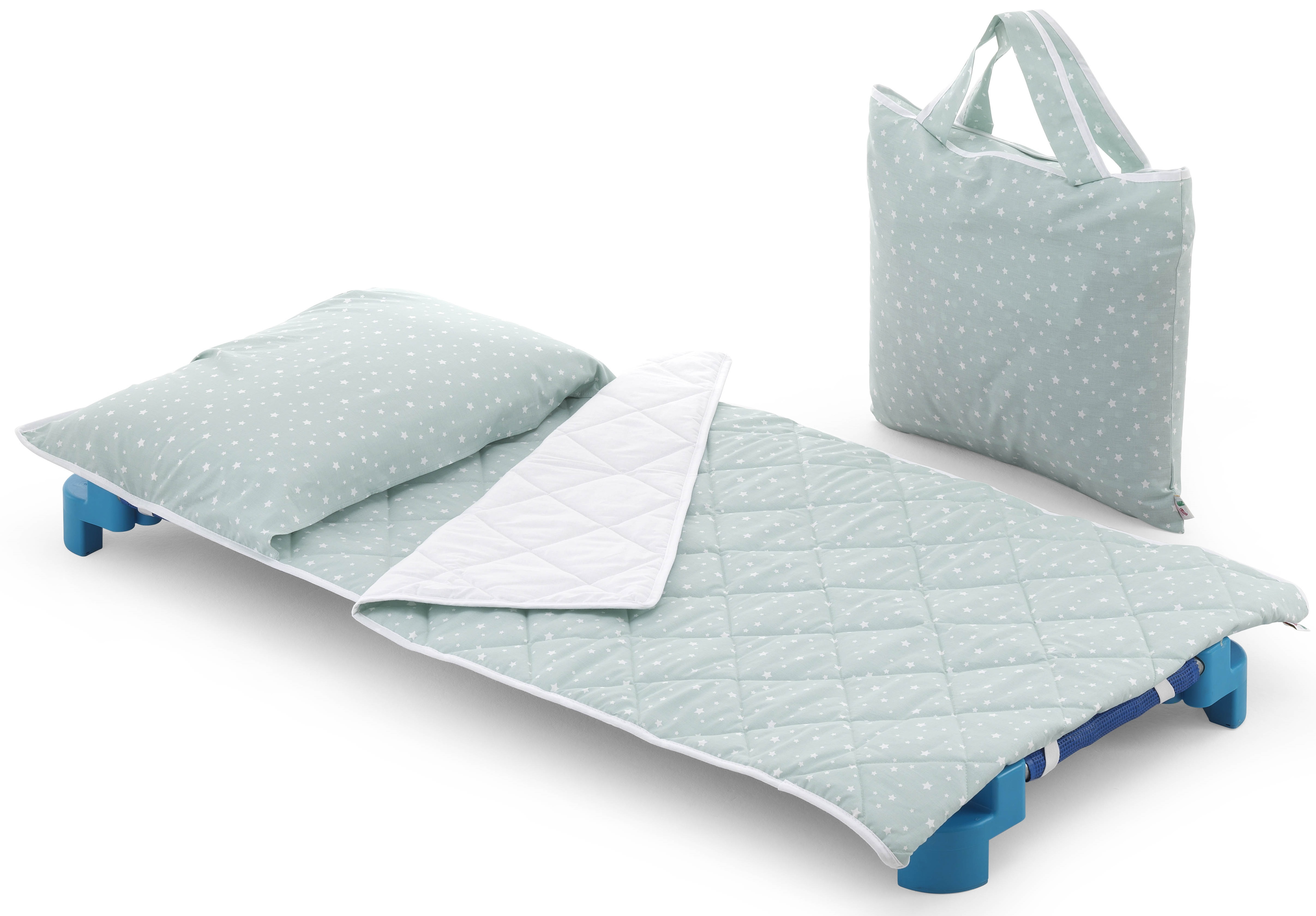 - Materassino realizzato con tessuto ignifugo e con elastici negli angoli per ancorarlo alla brandina (data in dotazione negli asili),