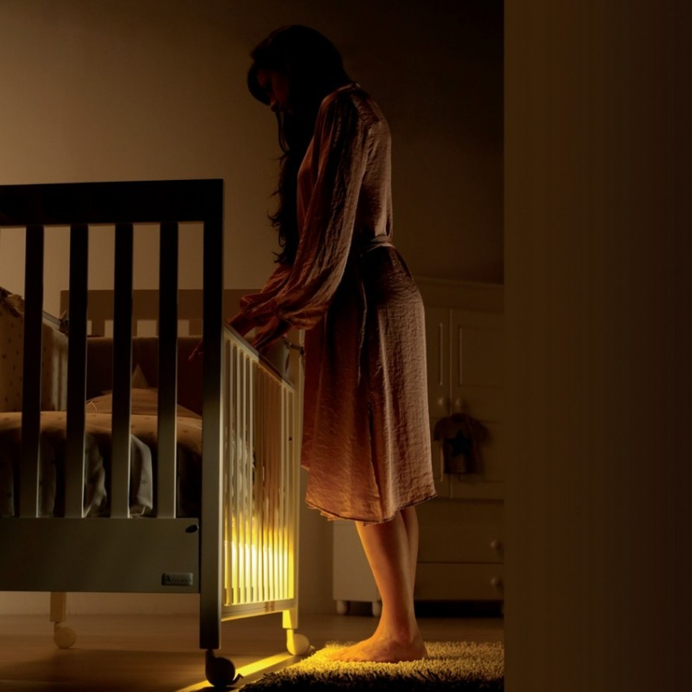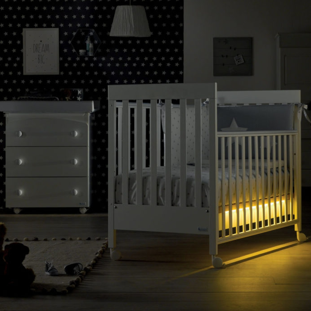 Per mezzo di un sensore la zona lettino si illumina quando la stanza è immersa nel buio, basta avvicinarsi nel raggio di pochi metri ed una morbida luce calda vi permetterà di controllare il sonno del bambino senza svegliarlo.