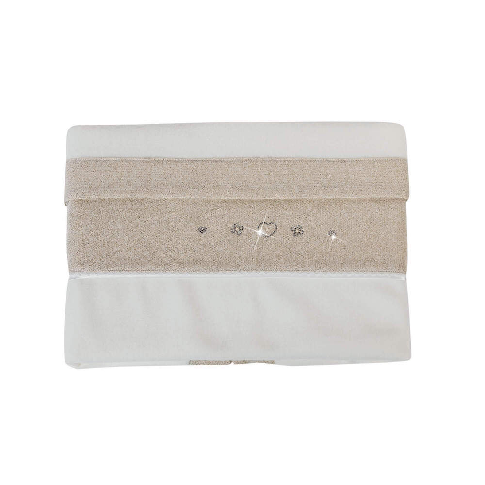 Questa copertina è stata realizzata in morbido tessuto, di colore crema e impreziosita da dettagli in Swarovski. Una linea romantica ed elegante che completerà la culla dei vostri piccoli.