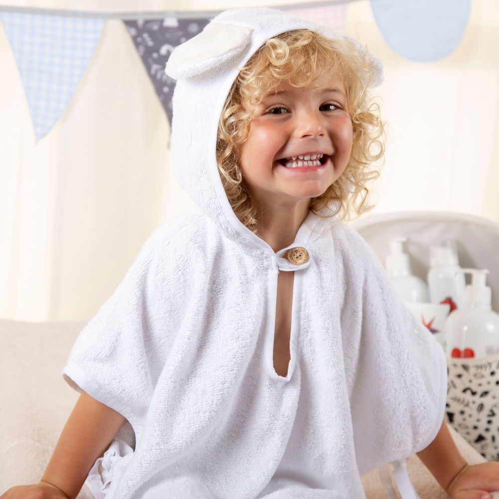 Il telo da bagno a Poncho realizzato da Dilibest, assorbe il 60% in più della tradizionale spugna in Cotone e grazie alle caratteristiche di questa fibra, risulta particolarmente delicato sulla pelle dei bambini.