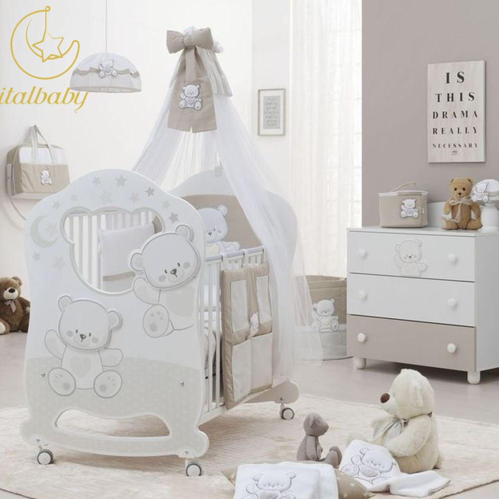 Le zanzariere Italbaby sono interamente realizzate in tulle di poliestere anallergico bianco, elasticizzato e antistrappo.